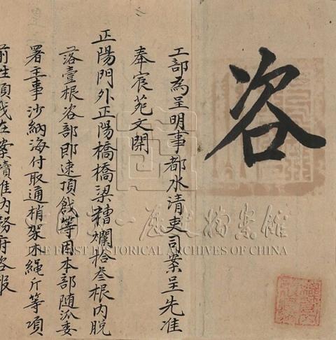 “正阳门外正阳桥桥梁糟烂,十三根内脱落一根……既经奏准拆修,相应呈明移咨内务府令派出承修之员,作何坚固保护之处,速行敬谨办理。”一件来自乾隆四年的文件上,当时工部与内务府之间关于正阳桥修缮的历史信息被详细地记录在案,让这座中轴图卷上的古桥面貌更加清晰。这只是本次开放的清代内务府来文档案中的太仓一粟。内务府是清代管理宫廷事务的专门机构,本次开放的相关档案主要是内务府接收其他衙门及官员的公文,内容涉及财务、土地房屋、修建工程、刑罚、织造、盐务等多方面,是反映清代宫廷政治、经济、生活面貌的重要史料。